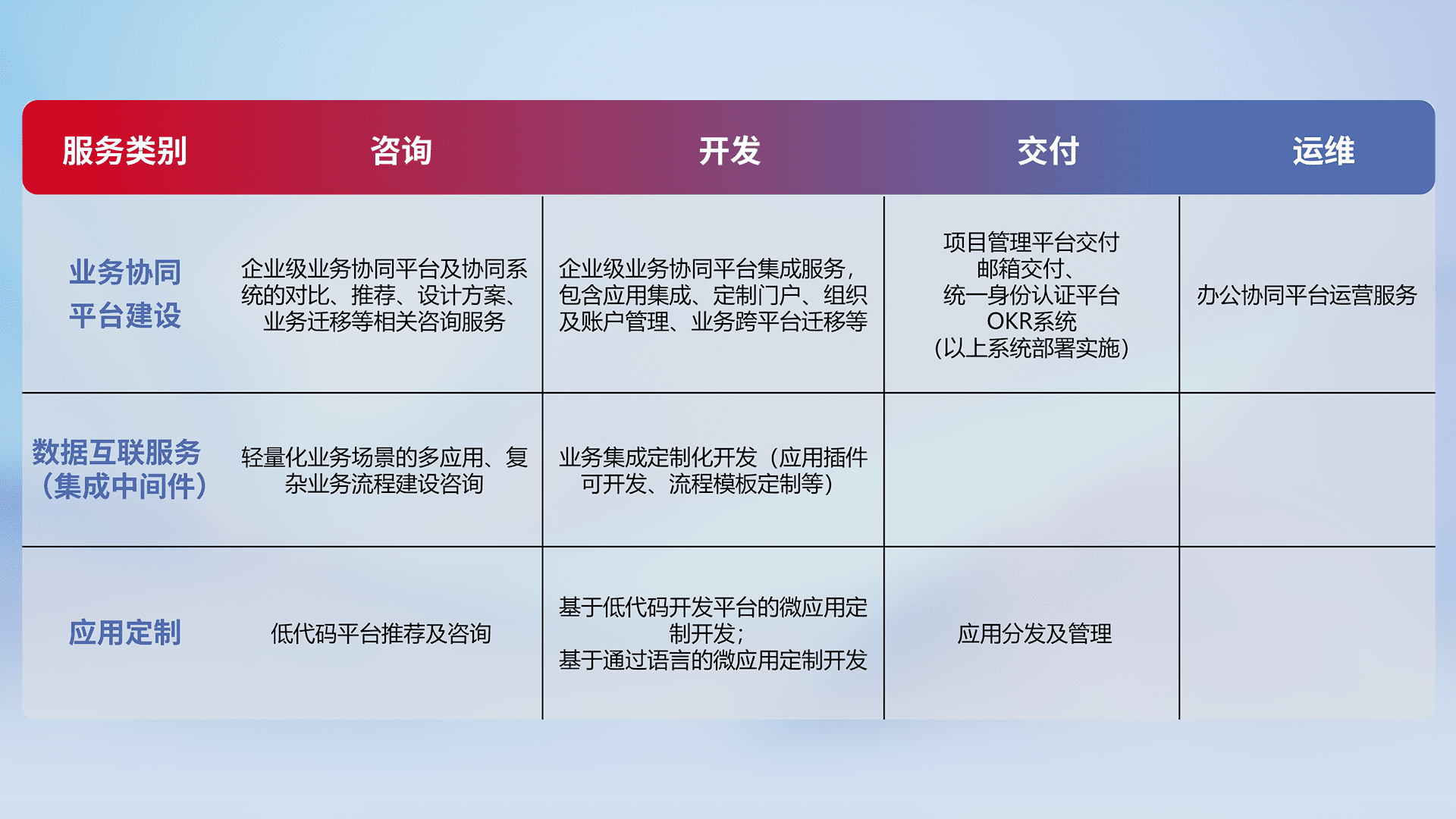 针对钉钉、、、企微、、、IDaas等平台级产品提供产品的规划、、方案、、交付、、、、定制化开发等服务,,,,实现如统一协同办公、、、、智能客户服务、、混合会议管理、、、智能数据查询、、等业务场景,,,,实现数字化转型。。。