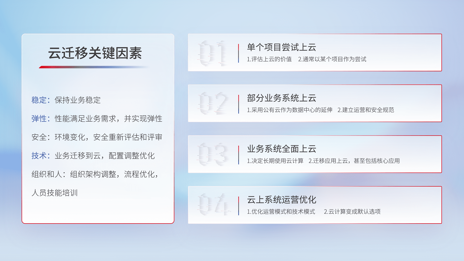 结合实际业务,,,从规划设计、、、云平台选型、、云原生改造、、数据迁移、、、、集成交付,,,迁移全过程为客户识别最佳上云路径,,,做好风险识别管理,,,,设计网络架构、、身份权限、、、、安全审计合规、、、、操作审计、、、日志审计、、、、监控告警策略、、、、多站点容灾设计等,,,对云上基础设施进行整体规划,,提升IT治理水平,,以满足弹性、、高可用、、、、高性能的需求。。。。