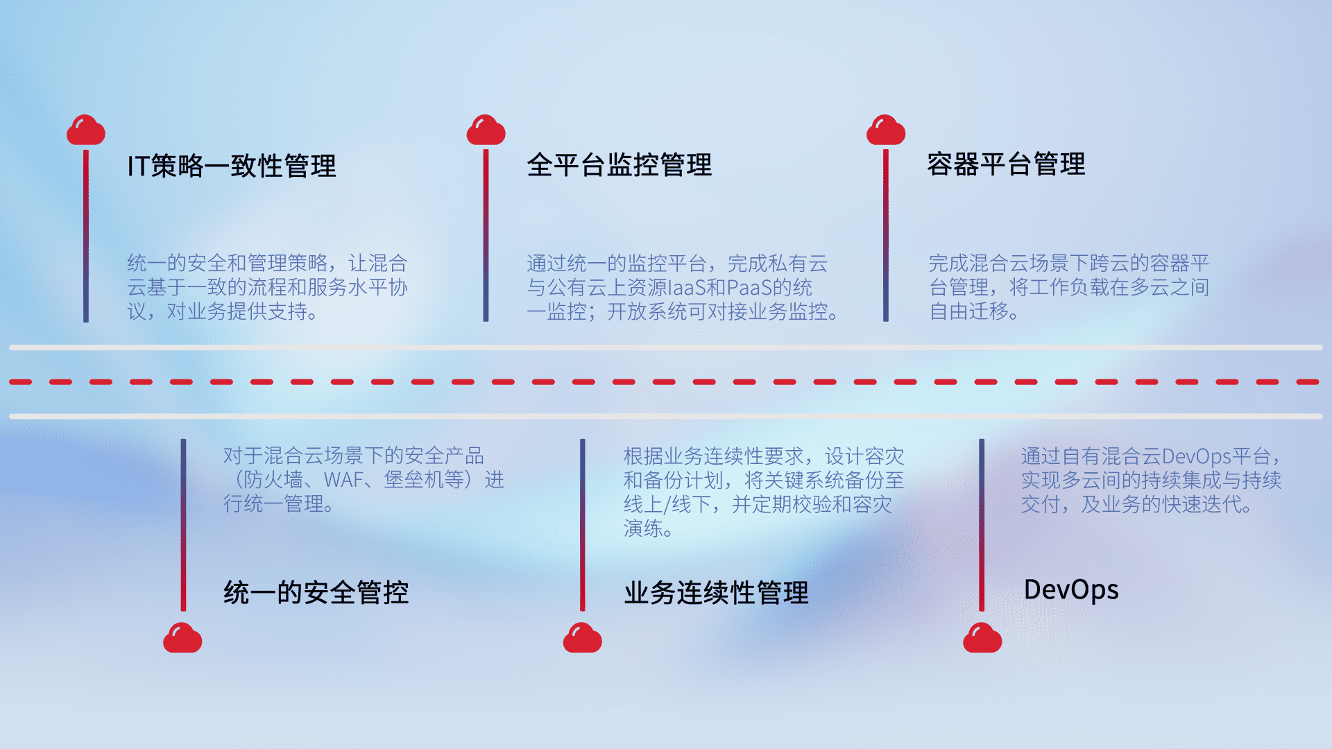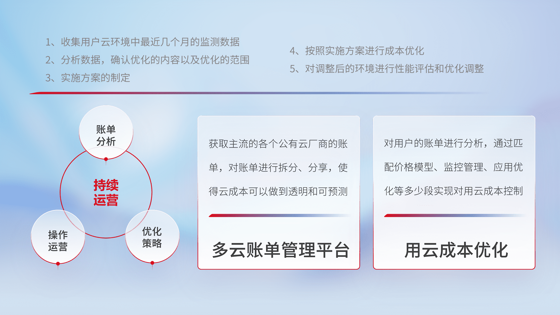通过多云纳管,,以统一的资源数据模型把客户的云资源进行抽象和封装,,进而实现对多云资源的统一操作,,,保障云资源管理的可靠性、、、、稳定性与可用性。。量身定制化运维内容,,,配置、、、、开发运维、、、、补丁管理、、、备份、、、监控、、、、认证和访问管理、、审计和日常巡检等,,保障在用云过程中的可靠度,,稳定度以及高可用率。。